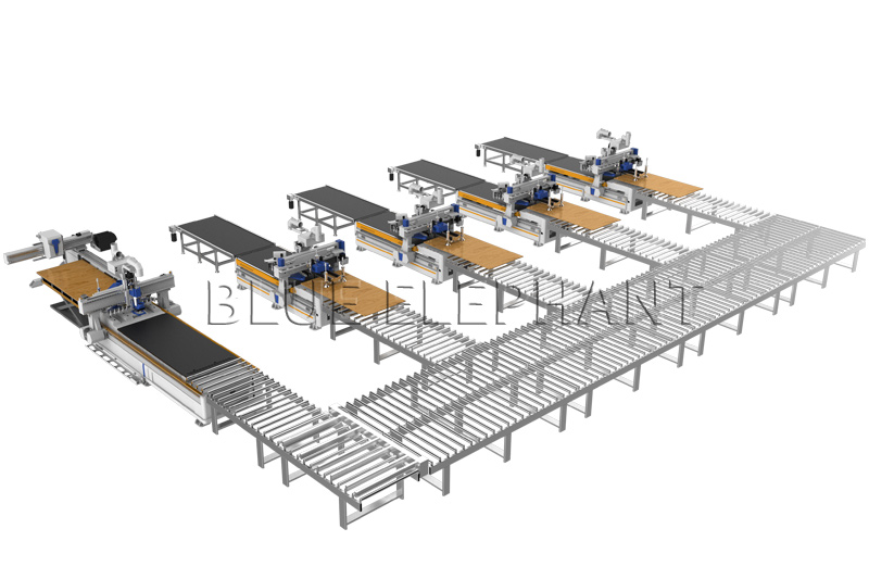 3、所有的步驟全部自動化完成。所有板材通過中央控制器分配至各個加工中心,包括正反面的造型,鉸鏈孔,玻璃門的加工,并適用于所有的家具生產(chǎn)軟件。