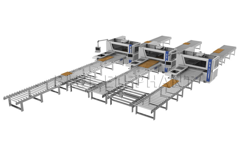 封邊完成的板材被送入至六面鉆---完成全部打孔后采用“前進(jìn)前出”或“前進(jìn)后出” 板料輸出方式---進(jìn)入緩存?zhèn)},進(jìn)行后續(xù)分揀打包