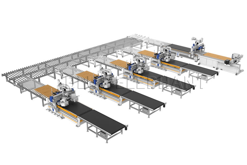 叉車上料--自動貼標(biāo)貼標(biāo)簽--機(jī)器自動抓料加工絞鏈孔、拉直器槽、玻璃門背面加工--傳輸?shù)椒鍣C(jī)翻板--自動傳輸分配到各門型加工中心--加工門型并切割--加工完推到出料平臺并同時上料循環(huán)加工